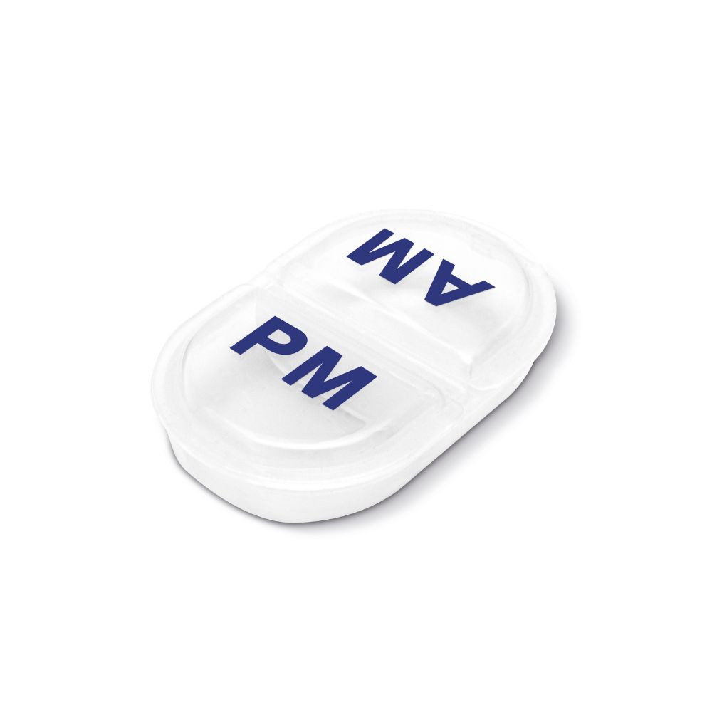 Pastillero con compartimento para organizar el medicamento del día y la noche. Tamaño ideal para llevar en bolsillo o bolsa de mano.